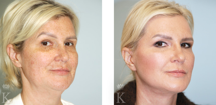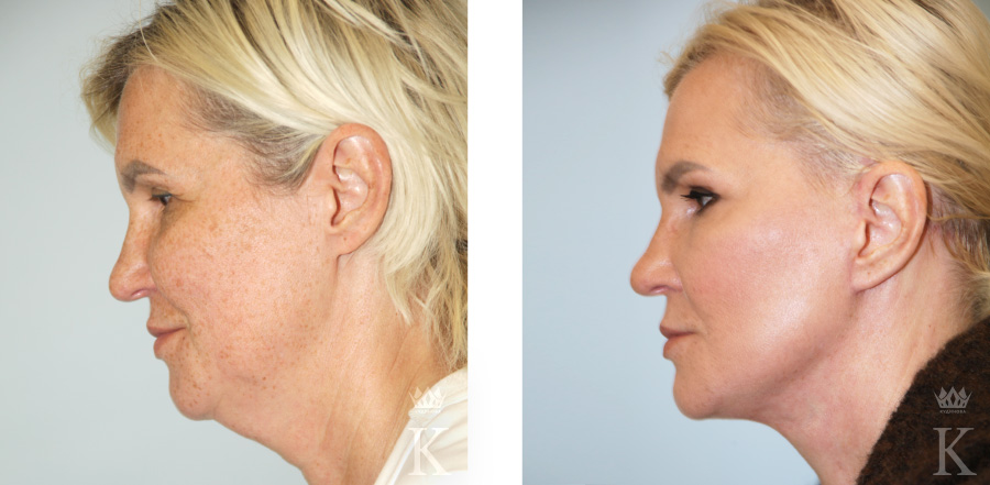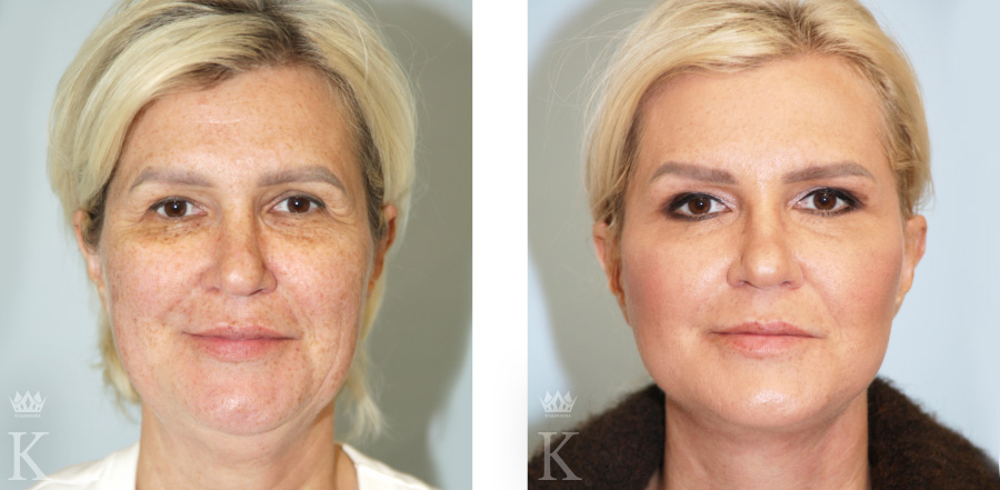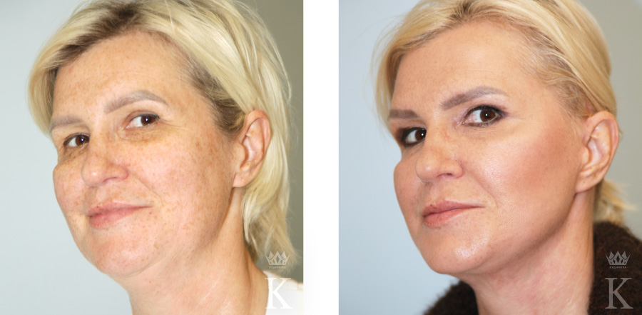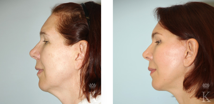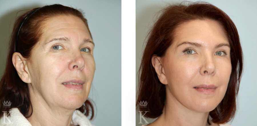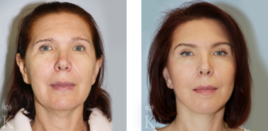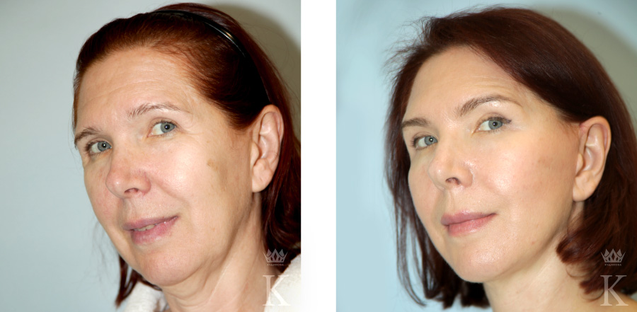 Пациентке выполнена операция HD-lifting верхней, средней и нижней зон лица – (СМАС подтяжка лица и шеи, липосакция в области передней поверхности шеи, задняя пластизмопластика), подтяжка бровей по собственной методике доступом через надбровную область), одномоментно выполнена верхняя и нижняя блефаропластика.