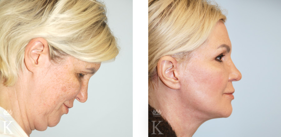 Пациентке 46 лет. Проведена комплексная коррекция возрастного птоза лица и шеи, избыток кожи, устранены жировые грыжи в области верхних век. Выполнена СМАС подтяжка лица и шеи (в том числе задняя платизмопластика и липосакция в области подбородка и передней поверхности шеи). Вторым этапом сделана верхняя блефаропластика.