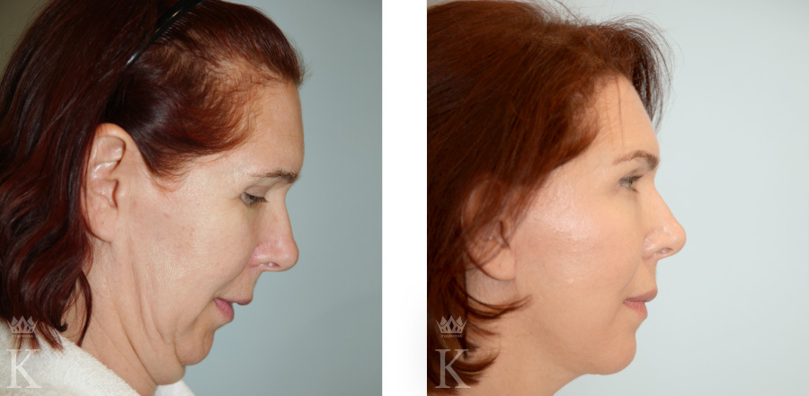 Первый этап — подтяжка лица и шеи (в том числе задняя платизмопластика, а также липосакция в области передней поверхности и зоны подбородка). Второй этап (спустя год) — верхняя блефаропластика.